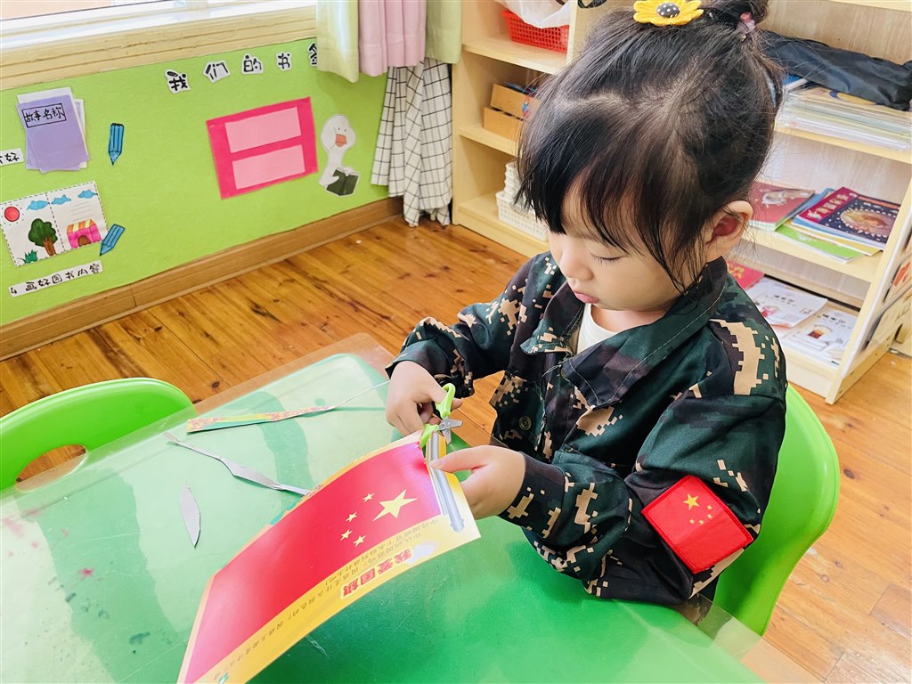 瞧,除了制作红旗外,孩子们还身着统一的迷彩服,想要做个小红军重走长征路,他们爬雪山、过沼泽、历经困难最终取得胜利,拿到小红旗!最后,孩子们和教师们一起歌颂祖国,唱出了对祖国妈妈最真挚的祝福。